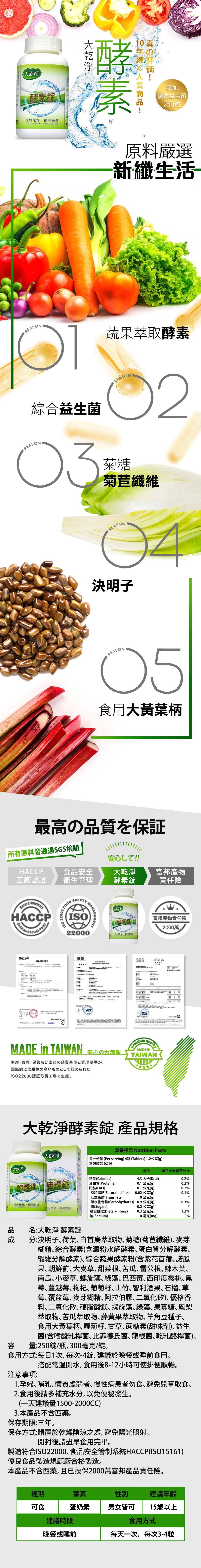 主要成分:綜合酵素(含蛋白質分解酵素、澱粉水解酵素、脂肪分解酵素、纖維分解酵素)、決明子萃取物、羊角豆、綜合蔬果複方萃取物(含高麗菜、苦瓜、菠菜、鳳梨、紅蘿蔔、花椰菜、芹菜、荷蘭芹、牛蒡、山藥、白菜、生薑、黑木耳、青木瓜、石榴、黑莓、奇異果、桑椹)、鳳梨萃取物、檸檬草、山楂葉、小茴香、果寡糖、螺旋藻、綠藻、蔗糖素、山梨醇、乳酸菌(含比菲德氏菌、嗜酸乳桿菌、保加利亞乳桿菌、酪酸乳桿菌)硬脂酸鎂。