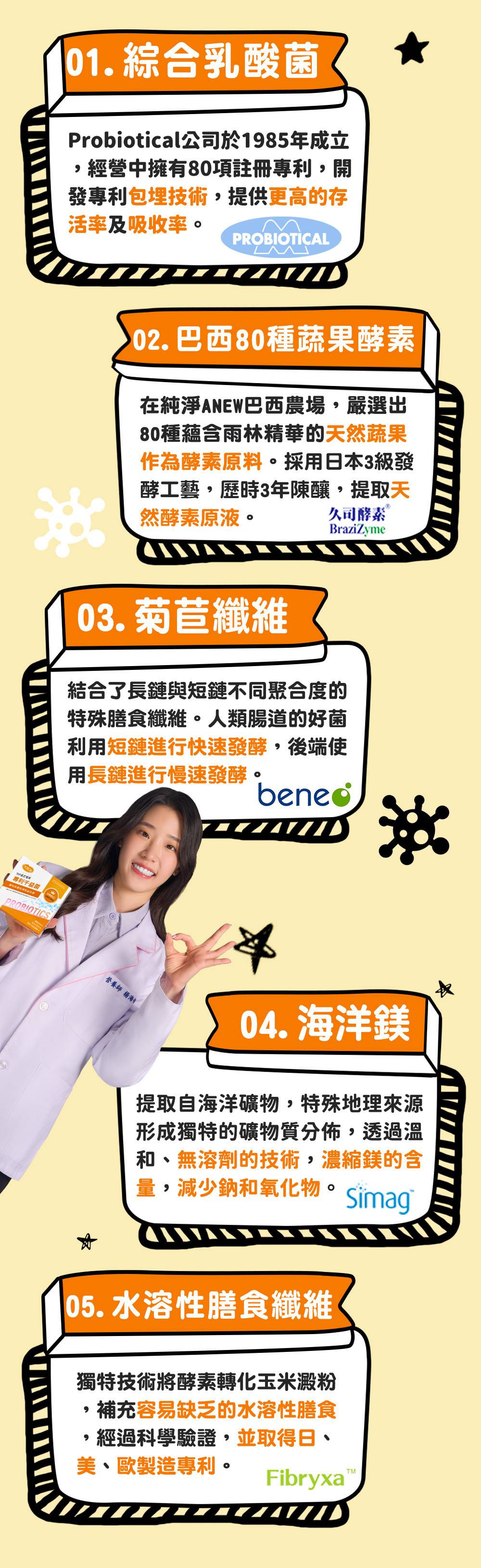 成 分:異麥芽寡糖、玉米來源可溶性纖維、菊苣纖維、海水濃縮物(含鎂)、優格粉、義大利專利綜合乳酸菌(麥芽糊精、乳雙歧桿菌、短雙歧桿菌、鼠李糖乳桿菌、植物乳桿菌、副乾酪乳桿菌、嗜酸乳桿菌、乾酪乳桿菌、長雙歧桿菌、兩歧雙歧桿菌、羅伊氏乳桿菌、戊糖乳桿菌、捲曲乳桿菌、發酵乳桿菌、加氏乳酸桿菌、嬰兒雙歧桿菌、唾液乳桿菌)、綜合蔬果發酵物/酵素(麥芽糊精、昆布、裙帶菜、紫菜、香菇、檸檬馬鞭草、苦艾、西番蓮、金盞草、大飛陽草、牛筋草、檸檬草、大茴香、馬黛茶、魚腥草、紫蘇、薰衣草、洋甘菊、生薑、益母草、番石榴葉、丁香、咸豐草、迷迭香、燕麥片、玉米、大麥、豌豆、紅豆、薏苡仁、芝麻、刺槐豆、小米、大豆、黑麥、黑豆、鷹嘴豆、扁豆、糙米、鳳梨、香蕉、蘋果、木瓜、番石榴、甜瓜、酪梨、梅子、西印度櫻桃、檸檬、葡萄乾、芒果、楊桃、西瓜、腰果、核桃、奇異果、梨子、巴西莓、卡姆果、萊姆、玫瑰果、橘子、樹莓、柳橙、水蜜桃、紅蘿蔔、甘藍、蓮藕、牛蒡、菊苣、地瓜、南瓜、木薯、番茄、羽衣甘藍、青椒、紅甜菜、胡蘿蔔、微結晶狀α-纖維素)。